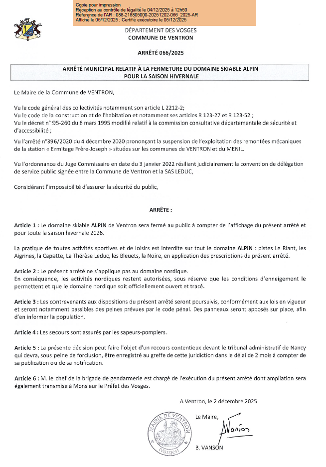ARRÊTÉ MUNICIPAL 066/2025 RELATIF À LA FERMETURE DU DOMAINE SKIABLE ALPIN