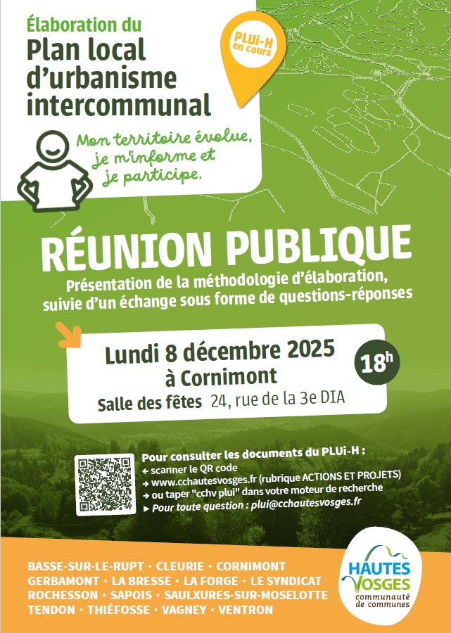 La CCHV vous informe de la tenue d’une 2èmeréunion publique, organisée Lundi 08 décembre 2025 à 18h00 à la Salle des Fêtes de CORNIMONT, dans le cadre de l’élaboration du Plan Local d’Urbanisme intercommunal, valant programme local de l’habitat (PLUi-H).