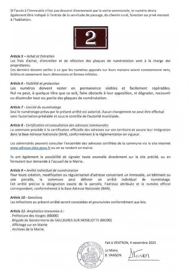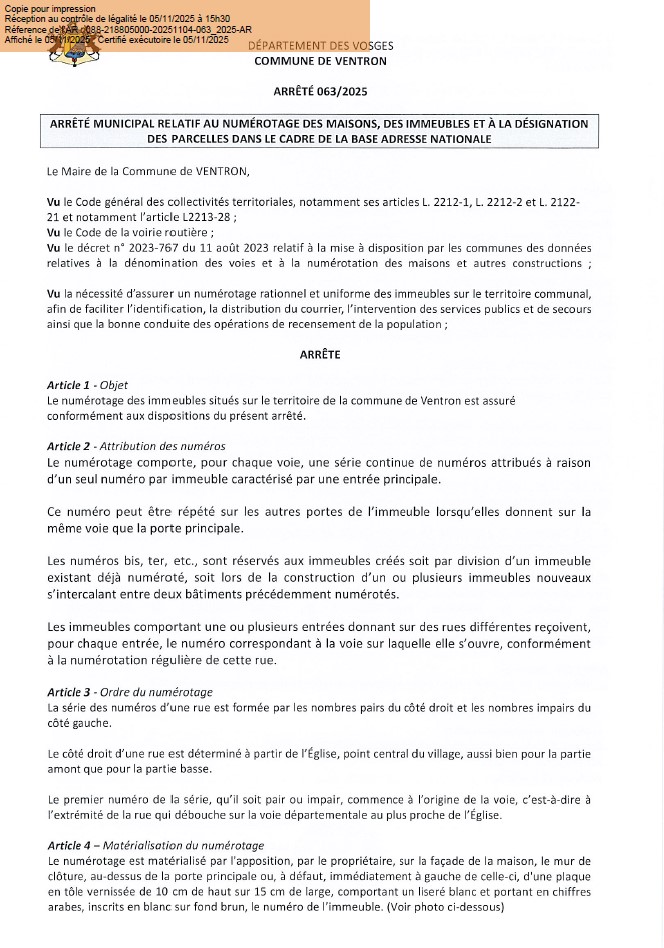 Pour répondre aux obligations du Décret 2023-767 du 11 août 2023 et afin de faciliter l’identification des habitations, la distribution du courrier, les interventions des services publics et de secours, ainsi que le recensement de la population, la commune met en place un numérotage officiel et uniforme des maisons (Arrêté municipal n°063/2025).